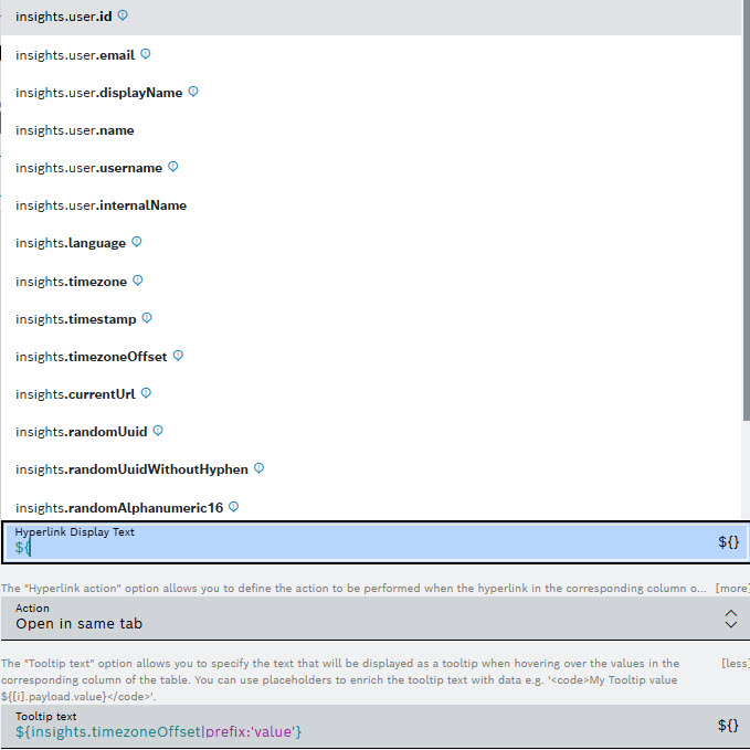 Typing ${ in a field that supports placeholders – marked with ${} at the end of the filed – displays the list of options to choose from:
