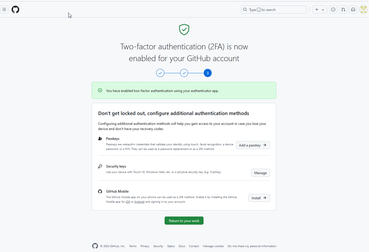 If your GitHub account does not have multi-factor authentication, you need to configure it to continue.