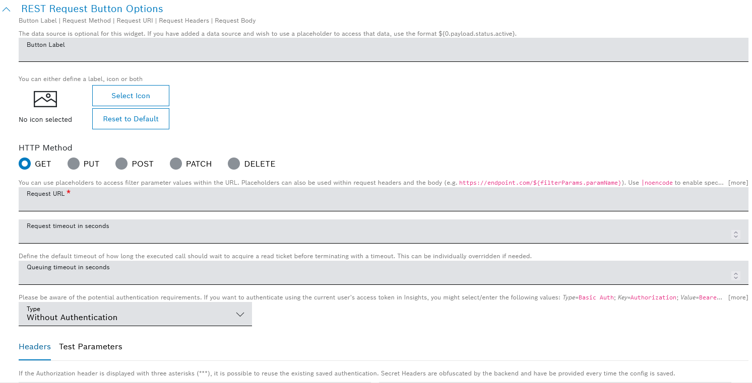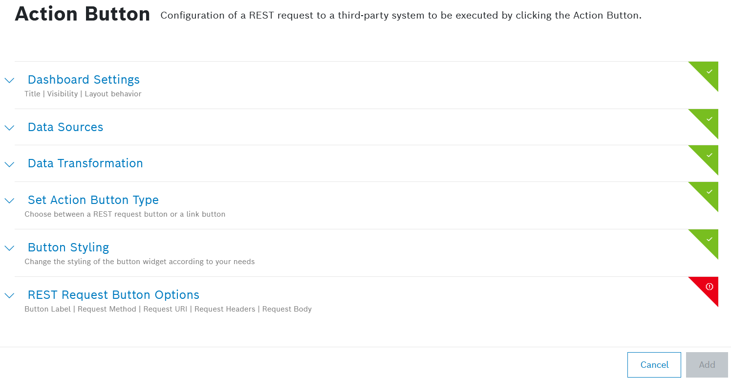 Using the Action Button widget, a button to execute REST request or to open a link can be configured. By clicking the Action Button, the REST request is executed or the link is opened.