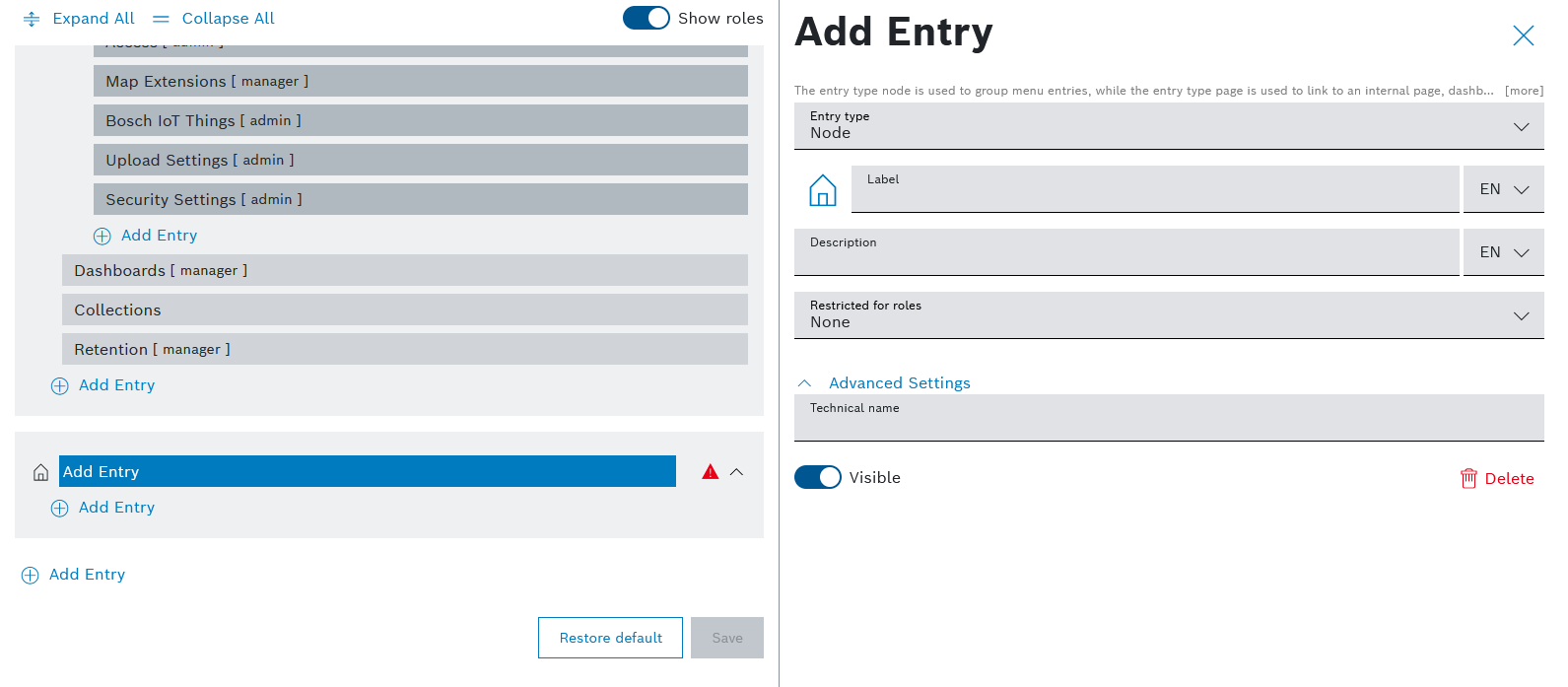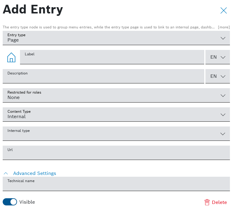 If you keep the default selection None, all roles will have access to the new menu item. - In the Advanced settings field, a Technical name for the new entry is automatically created, however, you are able to modify it.