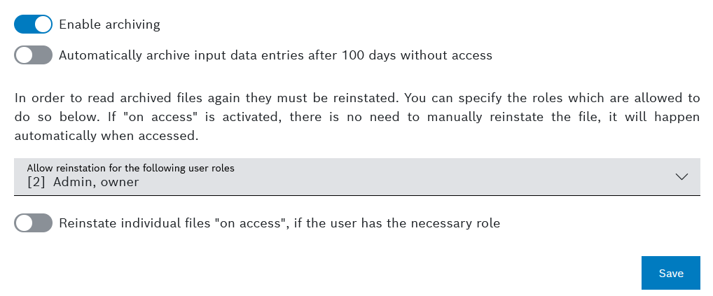 → With this toggle, manual archiving will be enabled. - Optionally, click the second toggle called Automatically archive input data entries after 100 days without access.