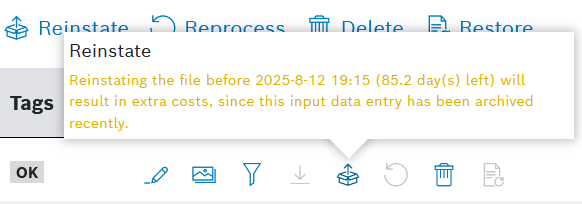 The reinstatement of the archived data, including its early reinstatement before expiry of the 90-day period of no access, can be configured for specific roles by the project Admin or higher role. For the cases of early reinstatement, the project will incur additional costs. We have added multiple warnings to help you avoid accidental costs related to that.