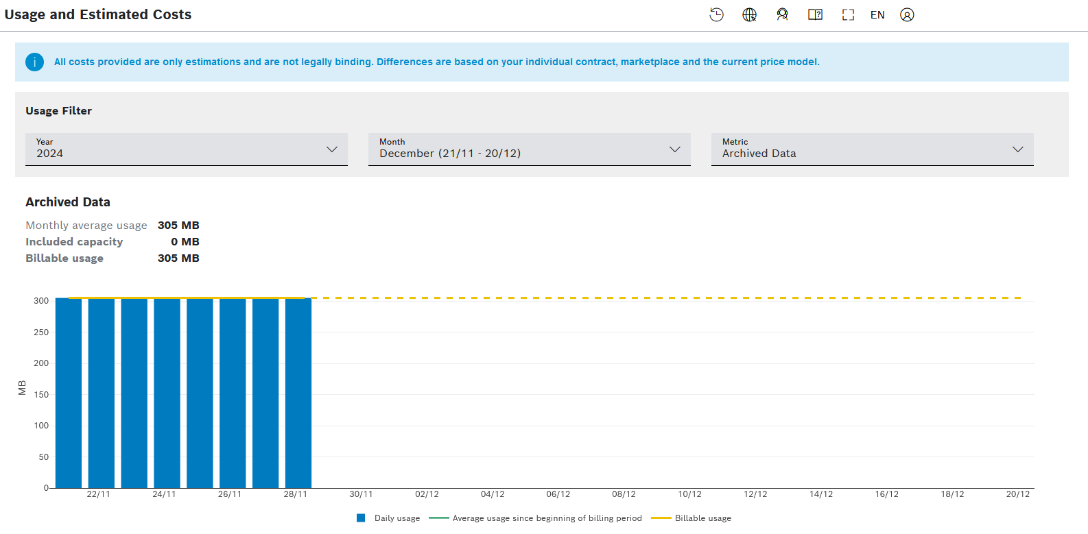 To check the costs related to the already archived data, navigate to Admin > Usage and Estimated Costs and on the Metric field's drop-down list choose Archived Data. For further details, refer to Usage and Estimated Costs.