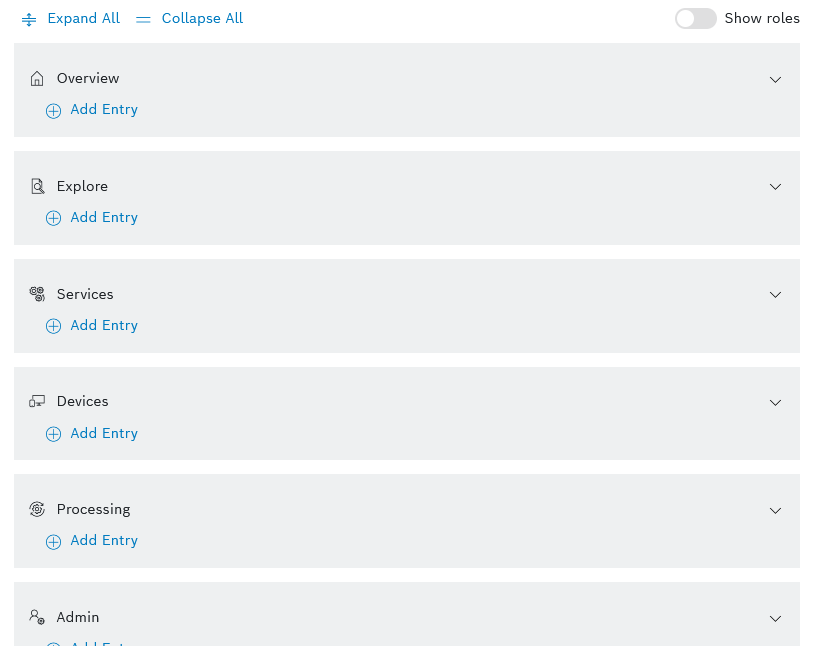 Use the Show roles toggle to show or hide from the current view the roles which have access to the specific menu items.