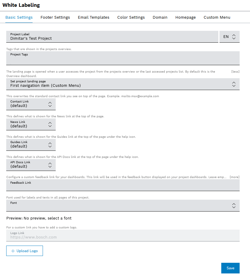 In the Basic Settings tab of White Labeling, you can define the project's label, tags, landing page, contact information, links, font, and logo.