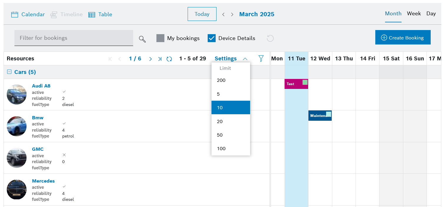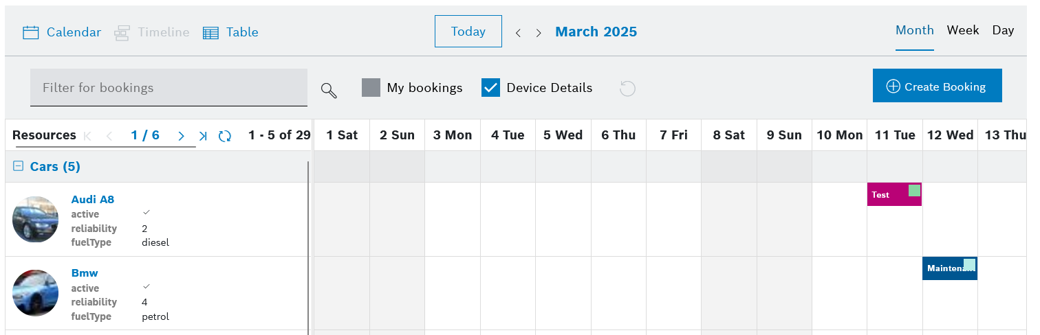 - Timeline Mode: Displays the resources and their bookings in the calendar.