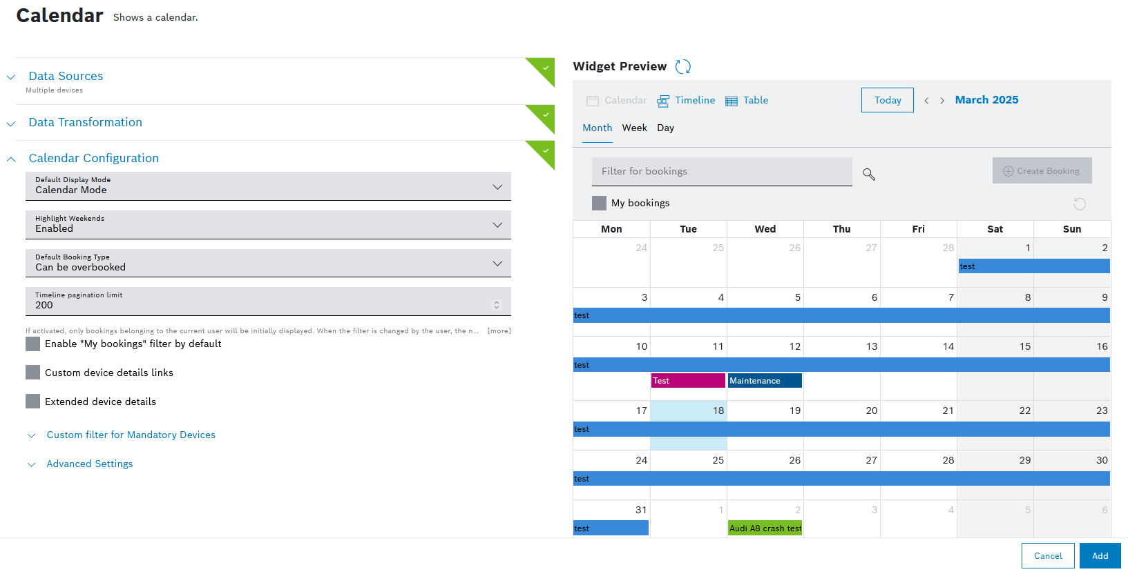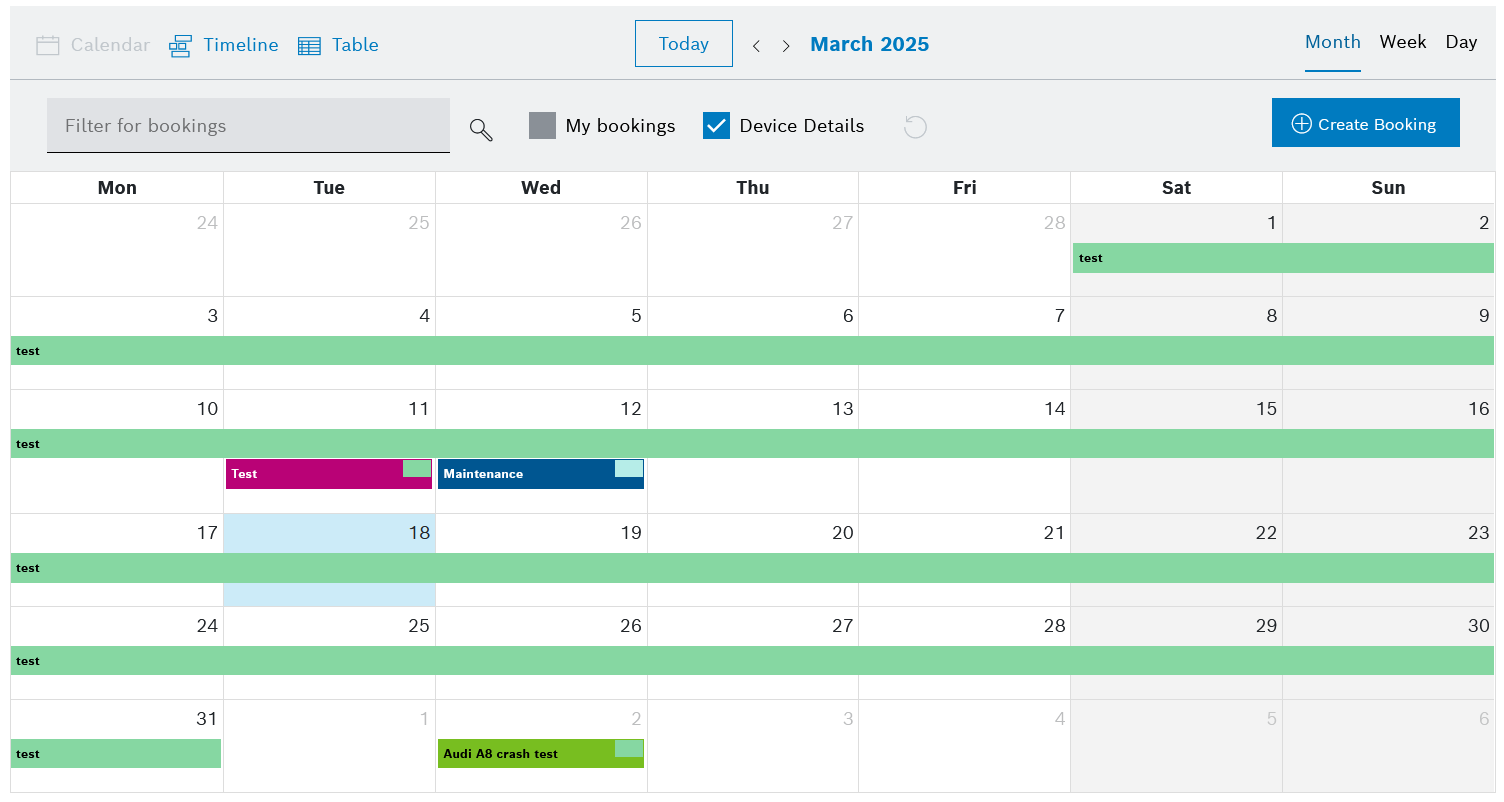 Using the Calendar widget, you can create bookings for devices. You can also create bookings for appointments that do not have to be linked to devices. The calendar can be displayed by month, week, or day.