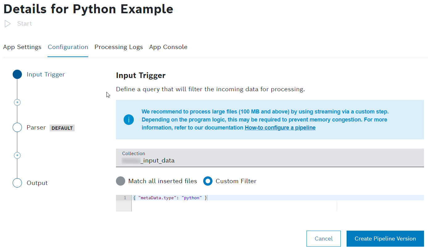 { "metaData.type": "python" }as the filter. Leave the Parser as it is.