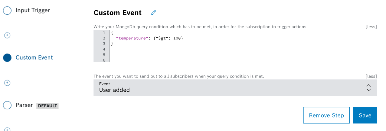 In the custom event step, you can write a query condition. If the condition is fulfilled, the incoming data to this step will be used to produce the configured custom event. Custom