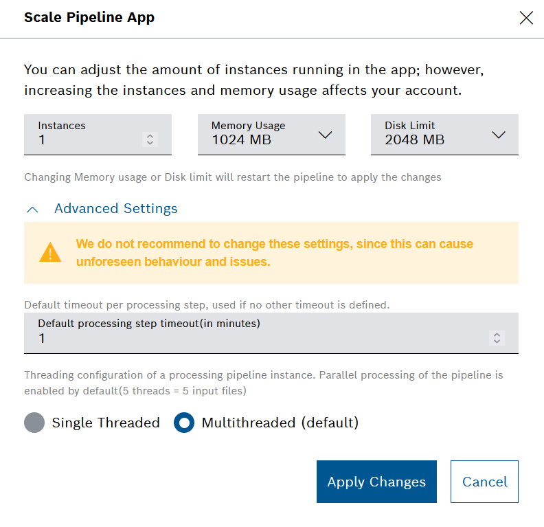 You can scale your Pipeline App by creating instances if it requires more memory or computation power. You can either increase the amount of instances that should run or order more memory per instance.