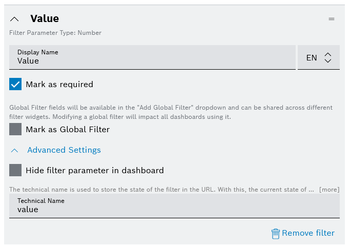 - Add a Date Time Range filter type with filter name Time Range and technical name timeRange.