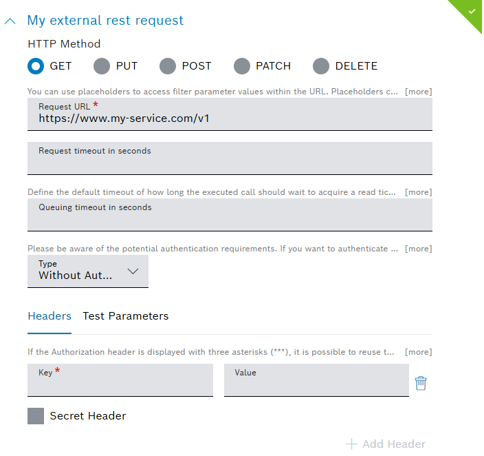 "myProperty": {"type": "staticPath","label": {"en": "Static path","de": "Static path"}}RestRequestDefinitionProvides a REST request definition editor in its own independent section.