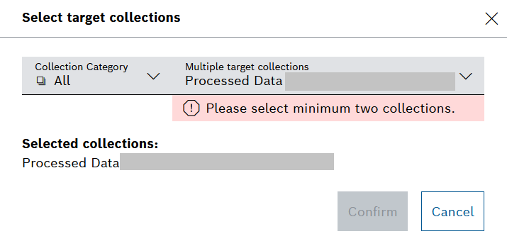→ The Select target collections dialog is displayed. - In the dialog, expand the corresponding drop-down lists to select a Collection Category and the allowed Multiple Target Collections.