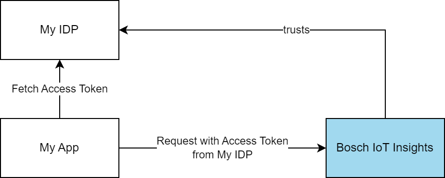 To use this feature you need to bring your own IDP, in which you manage clients, that represent e.g. an application (App). The App usually requests an access token from the IDP using the client credentials flow. The access token is then sent to the Bosch IoT Insights API.