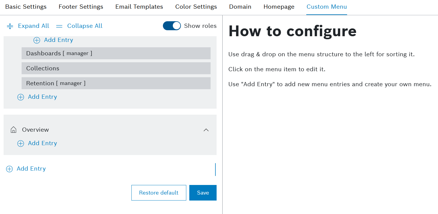 Furthermore, you can restrict the access to each menu item for specific roles only.
