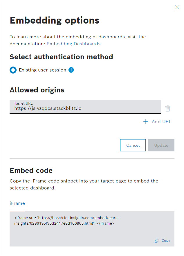 → The Embedding options dialog is displayed. In the Target URL, enter the URL provided by Stackblitz.