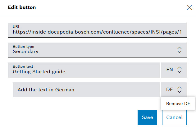 - Button type field for the Primary or Secondary options to determine the color of the button - blue or white, respectively,