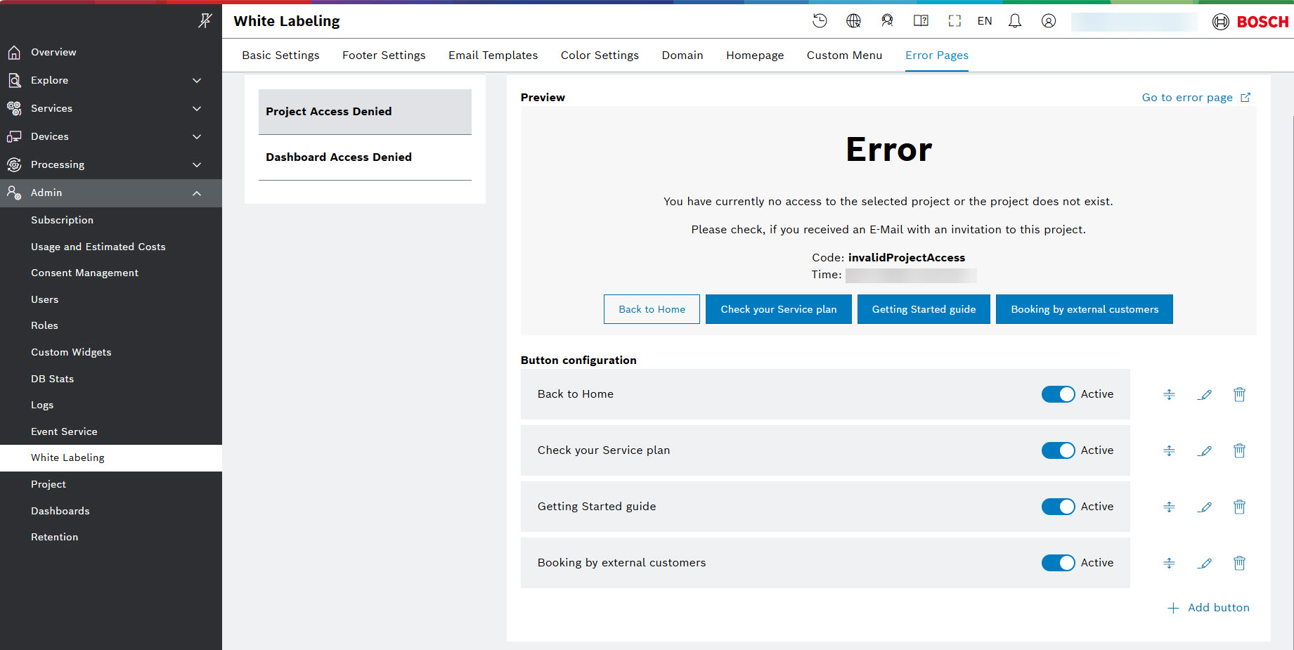 In the Error pages system tab, you can provide a project-specific links on the access denied pages for your users, so that they have the option to notify administrators or be redirected (e.g., via a link) to a relevant page for further assistance. This also helps the users understand the reason for the access restriction they see. In particular, you can create preconfigured link buttons, and mark them as active so that they be shown to the user.