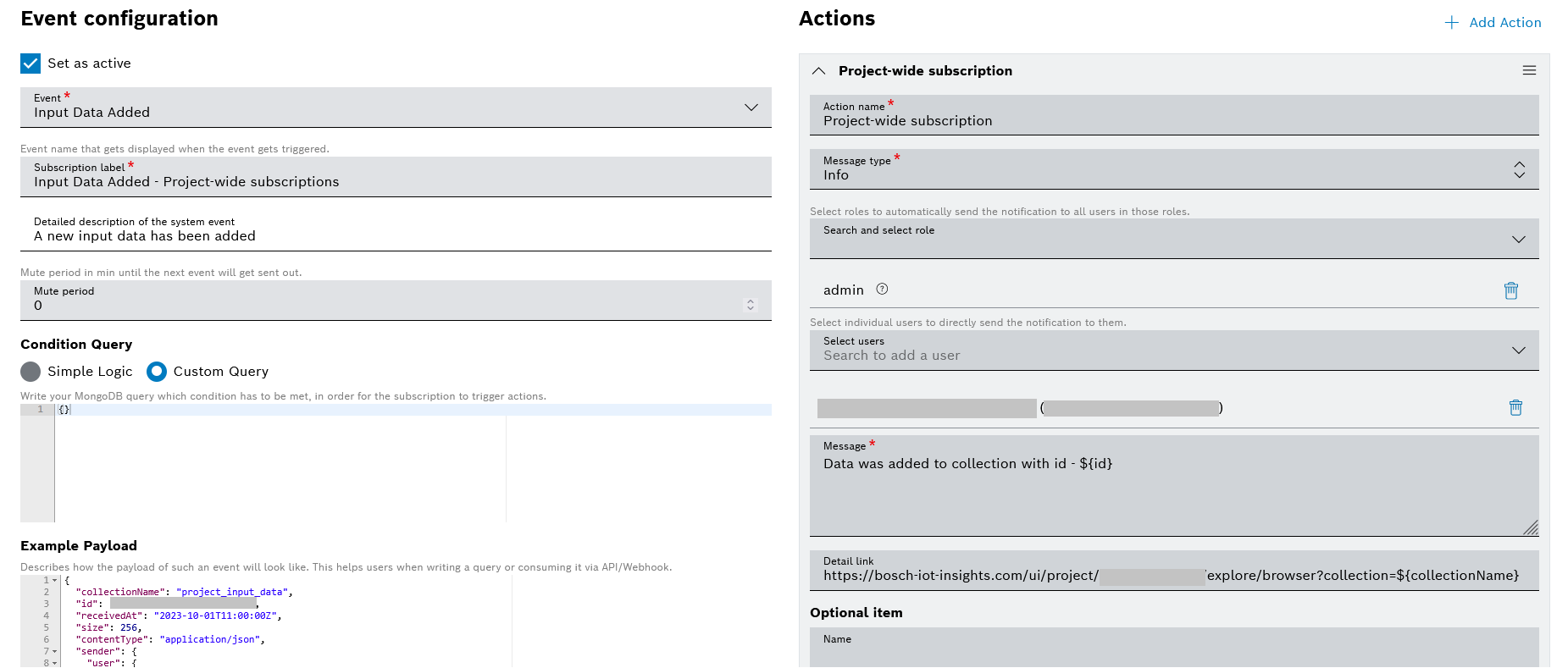 Bosch IoT Insights allows you to subscribe for events and to configure the respective action(s) which will be triggered when such an event is received.