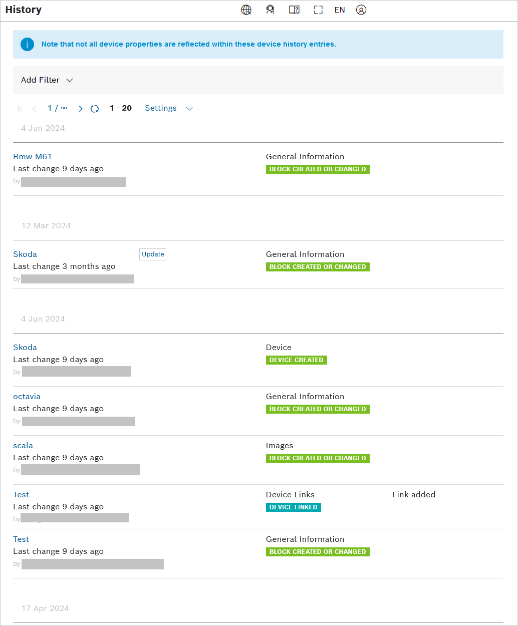 Under History, the changes applied to devices are tracked. Labels added to history entries give insights to current and past states of a device. The information to be tracked can be configured under Device Types so that the History only displays changes that are of importance to the user.