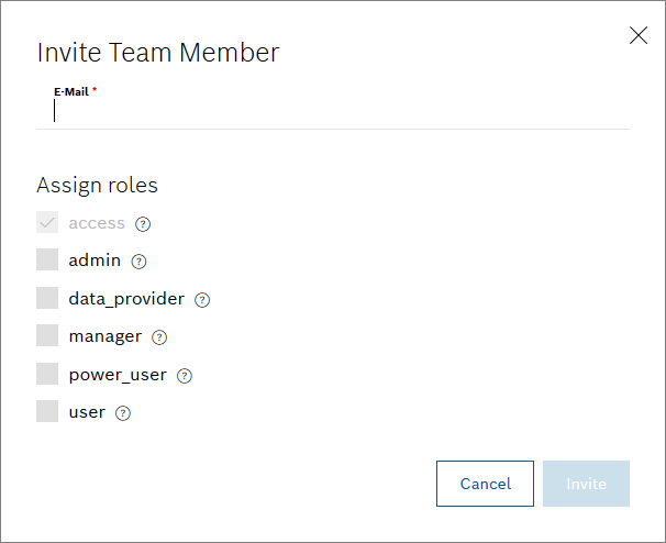 → The Invite Team Member dialog is displayed. - In the E-Mail field, enter the e-mail address of the user that shall be invited.