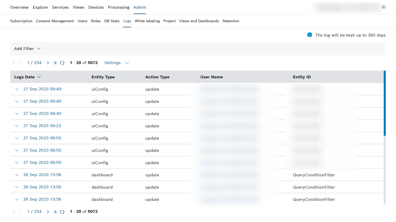 In Logs, user interactions are displayed. Based on the User ID and Entity ID displayed, each change can be associated with a user and the respective entity.