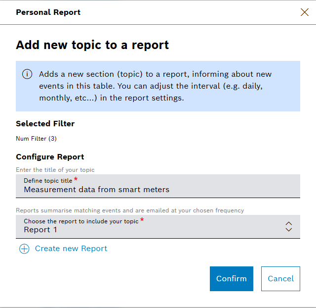 - In the Choose a report to include your topic field, select an already existing report (described earlier on this page) or create a new one by clicking Create new Report.