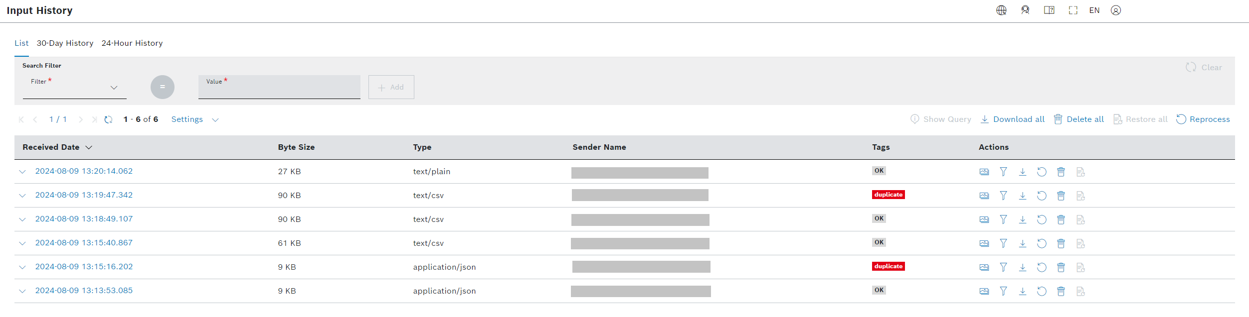 → The selected item, e.g. Input History, is opened and displays the data that has been uploaded.