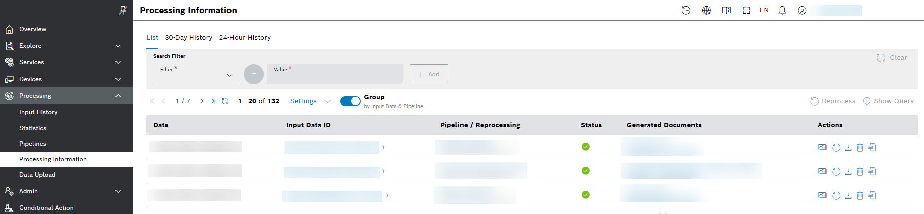 The trigger button Group by Input Data & Pipeline displays the latest status per input document and pipeline: