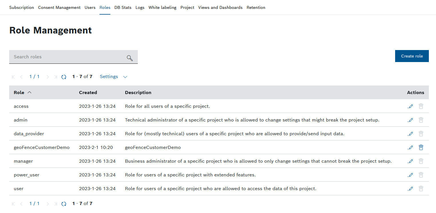 → The Roles menu item is displayed and shows the roles available for the project.