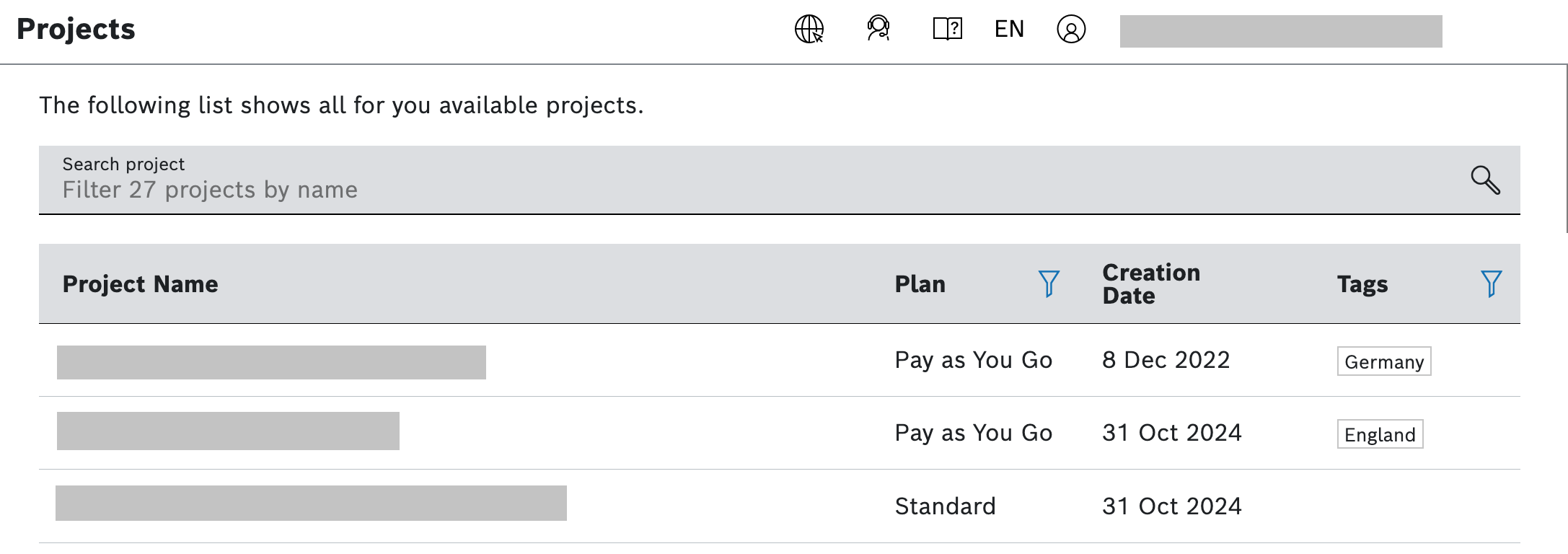 → The Projects Overview is displayed and provides a list of all your projects along with details such as type of Plan, Creation Date and Tags.